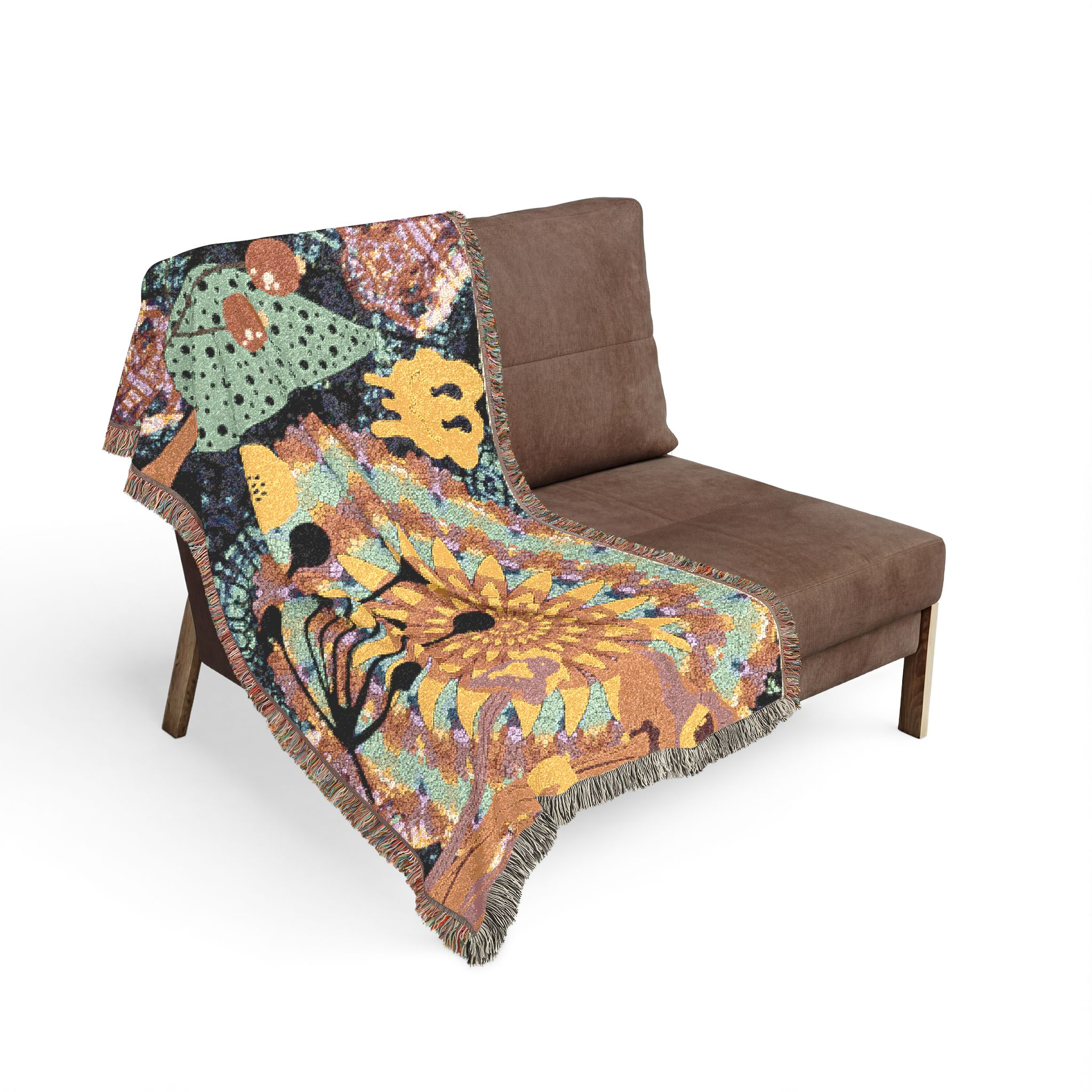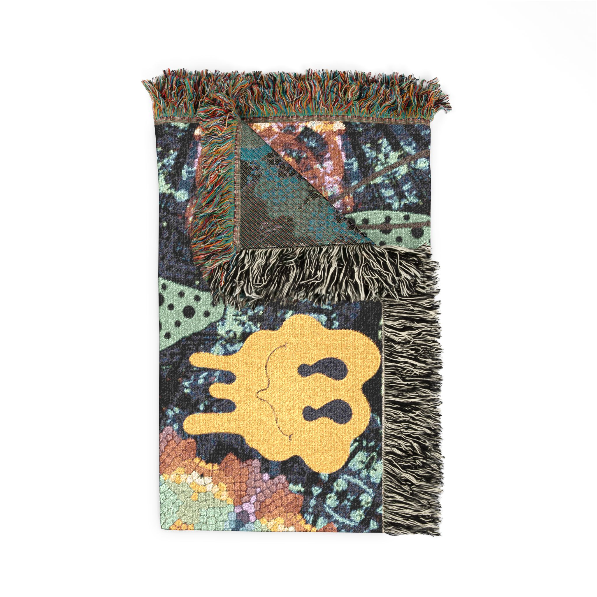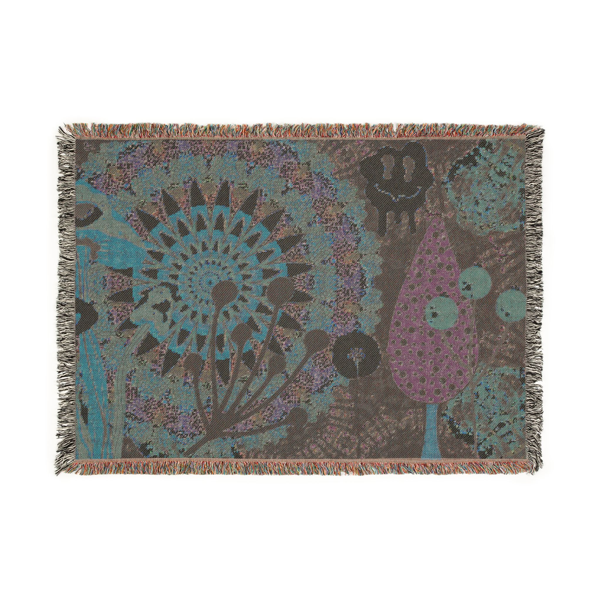 This woven blanket brings a playful, artful energy to cozy corners. Handwoven cotton threads form a tapestry of bold, blocky shapes—sunburst florals, whimsical trees and dripping smile motifs—that read like a joyful collage. The textured weave and colorful fringed edges give it a lived-in, tactile warmth that layers easily over a sofa, at the foot of a bed, or folded into a reading nook. Choose the Artwork variant to keep the graphic colors crisp, or the Photo variant when your design relies on softer gradients. The result is a vibrant throw that feels handmade and expressive, a bright companion for slow evenings and lively conversations.